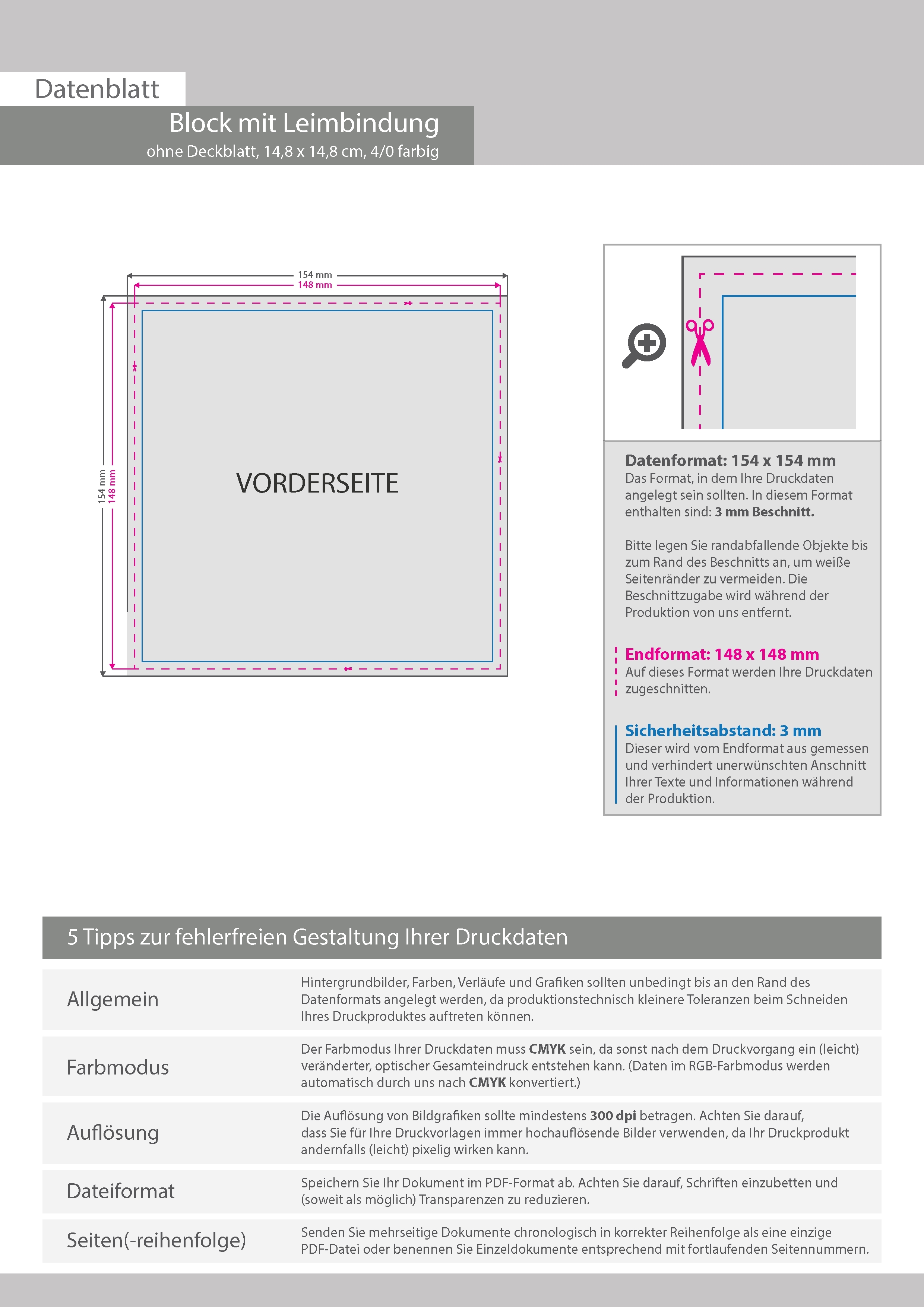 Block mit Leimbindung, 14,8 cm x 14,8 cm, 10 Blatt, 4/0 farbig einseitig bedruckt