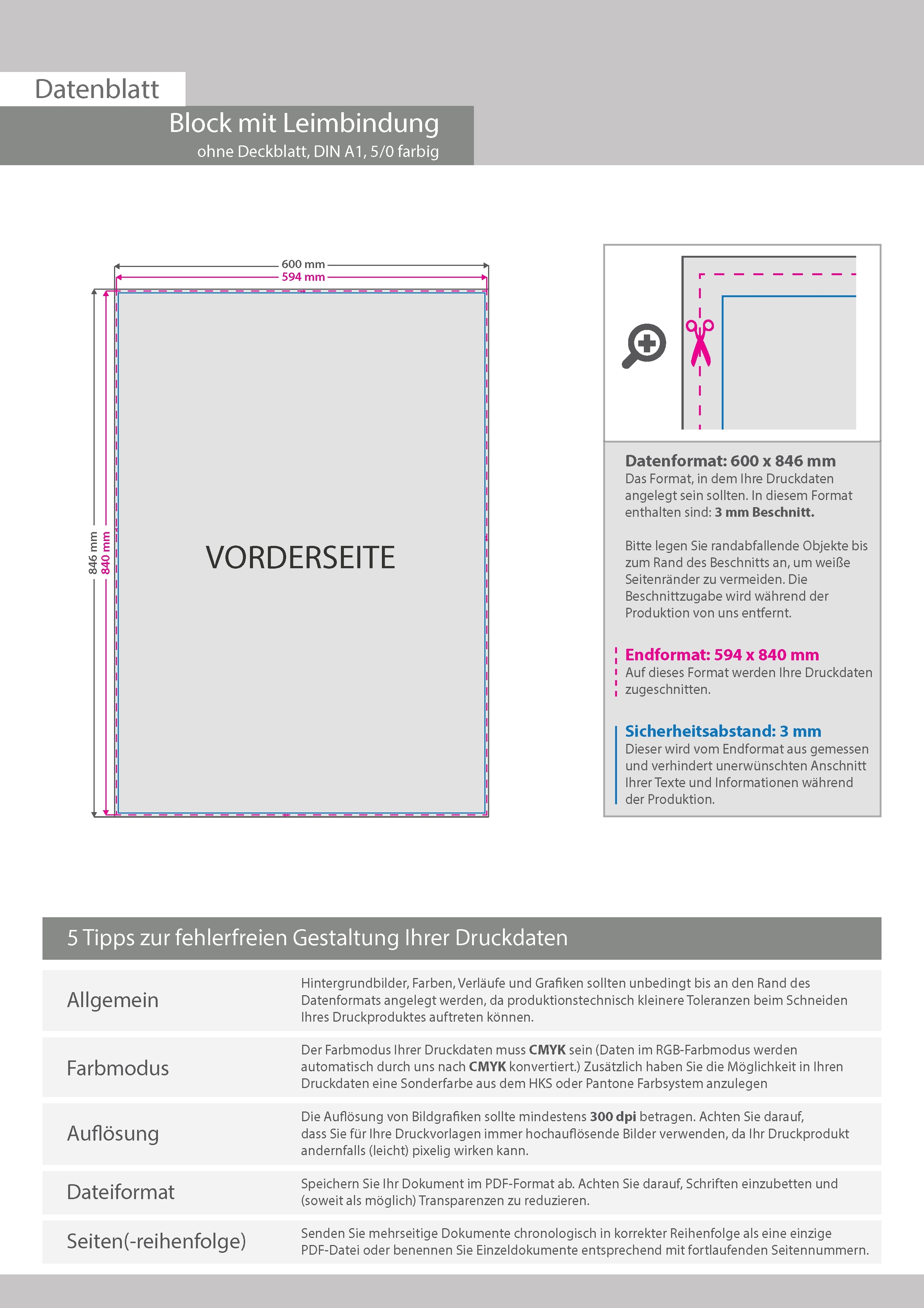 Block mit Leimbindung, DIN A1, 50 Blatt, 5/0 farbig einseitig bedruckt (CMYK 4-farbig + 1 Sonderfarbe HKS oder Pantone)